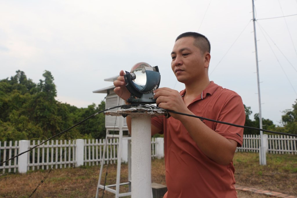 Anh Hoàng Huy, Trạm trưởng Trạm Khí tượng và Hải văn Hòn Ngư tại vườn khí tượng. Ảnh: Hoàng Hiếu - Minh Huệ