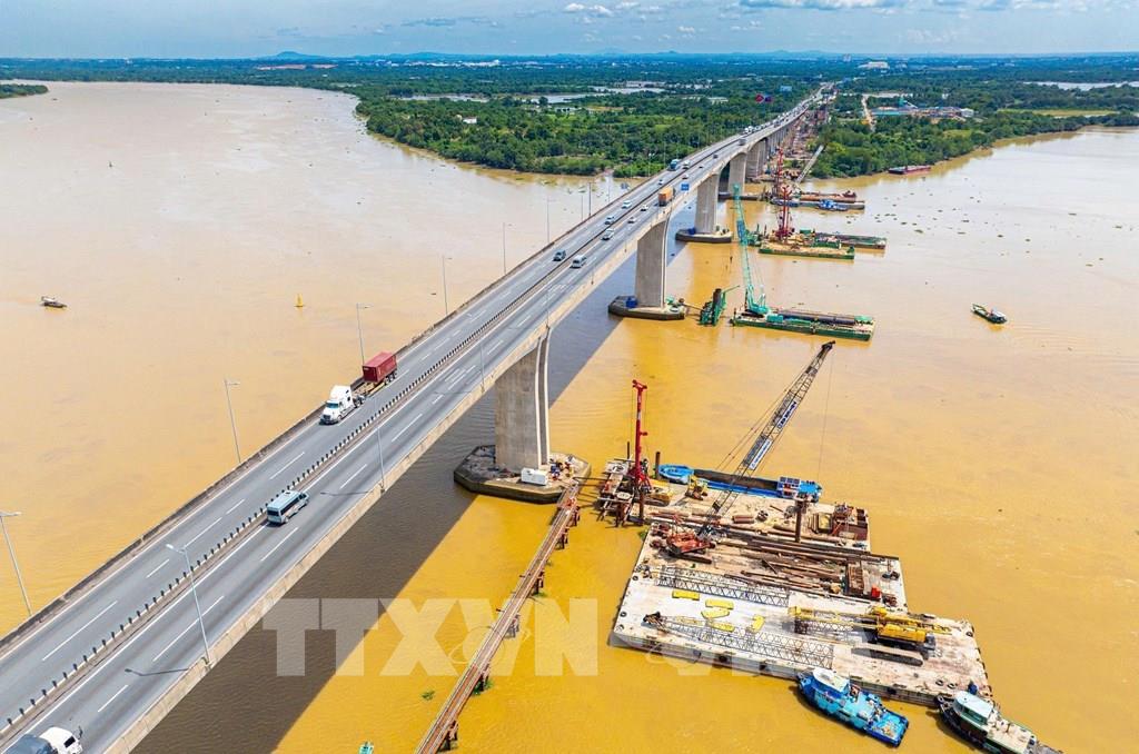 Thi công cầu Long Thành mới thuộc dự án mở rộng đoạn cao tốc Thành phố Hồ Chí Minh - Long Thành. Ảnh: Công Phong - TTXVN