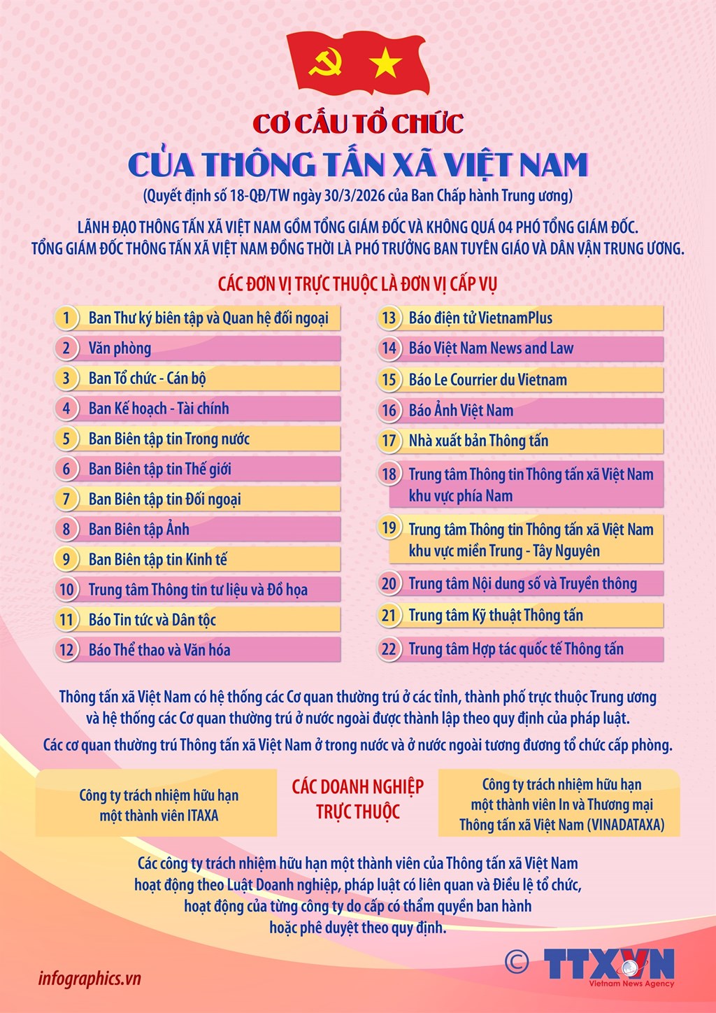 Thông tấn xã Việt Nam gồm Tổng Giám đốc và không quá 04 Phó Tổng Giám đốc. Tổng Giám đốc Thông tấn xã Việt Nam đồng thời là Phó Trưởng Ban Tuyên giáo và Dân vận Trung ương. Thông tấn xã Việt Nam có 22 đơn vị trực thuộc; có hệ thống các Cơ quan thường trú ở các tỉnh, thành phố trực thuộc Trung ương và hệ thống các Cơ quan thường trú ở nước ngoài và 2 doanh nghiệp trực thuộc. Đây là những nội dung quan trọng về cơ cấu tổ chức của Thông tấn xã Việt Nam theo Quyết định số 18-QĐ/TW ngày 30/3/2026 của Ban Chấp hành Trung ương.