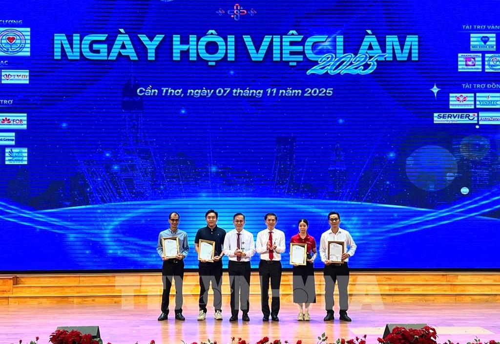 Trao Kỷ niệm chương cho các doanh nghiệp, nhà tuyển dụng đồng hành cùng chương trình. Ảnh: Ánh Tuyết - TTXVN