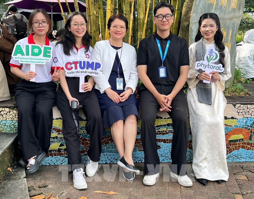 Nhóm đạt giải Nhất " Ý tưởng khởi nghiệp sinh viên năm 2025" mang sản phẩm trưng bày tại Ngày hội. Ảnh: Ánh Tuyết - TTXVN