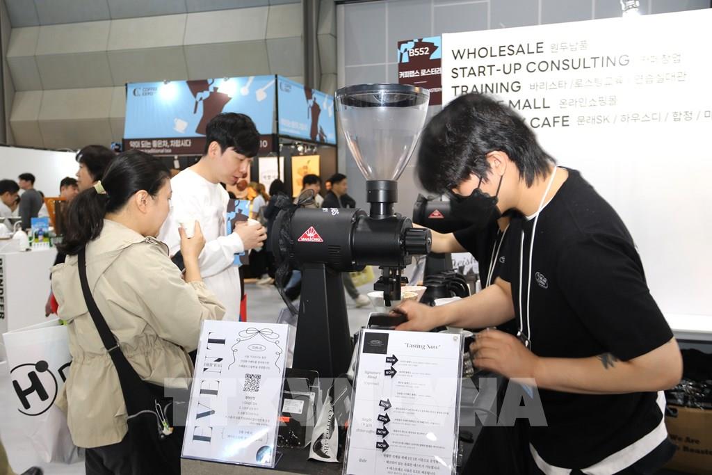Khách hàng Hàn Quốc quan tâm đến các sản phẩm cafe pha chế nguyên hạt. Ảnh: Khánh Vân - PV TTXVN tại Hàn Quốc