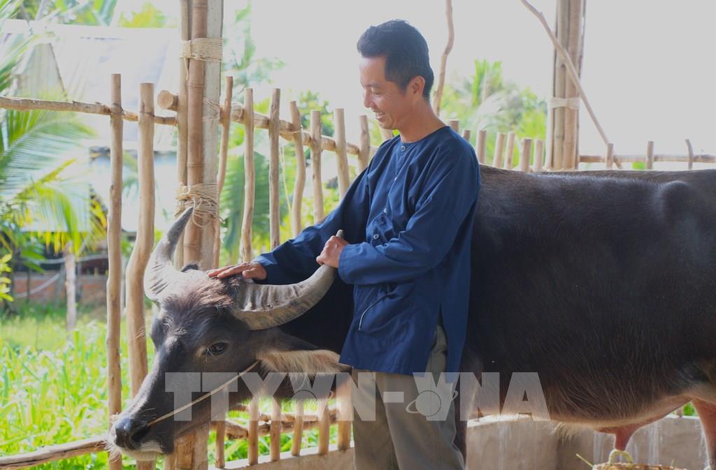 Anh Lê Văn Càng chăm sóc trâu phát triển du lịch. Ảnh: Nguyễn Hằng – TTXVN