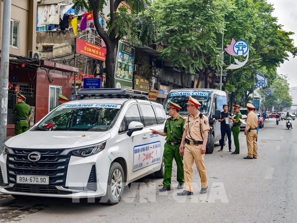 Lực lượng chức năng lập biên bản vi phạm đối với phương tiện dừng, đỗ không đúng nơi quy định trên tuyến Nguyễn Trãi. Ảnh: Trung Nguyên - TTXVN