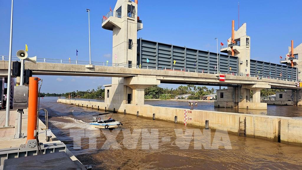 Cống âu Rạch Mọp ngăn mặn giữ ngọt. Ảnh tư liệu: Trung Hiếu - TTXVN