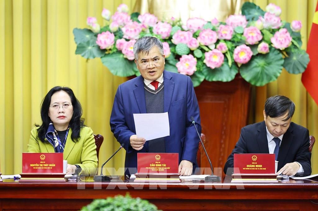 Phó Chủ nhiệm Văn phòng Chủ tịch nước, Trợ lý Chủ tịch nước Cấn Đình Tài, chủ trì Họp báo. Ảnh: Minh Đức - TTXVN