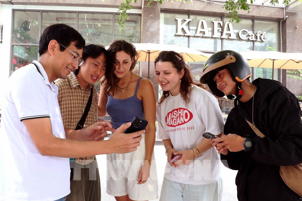Du khách được hướng dẫn tìm kiếm các thông tin du lịch trên điện thoại thông minh để du khách thuận tiện trong hành trình khám phá Tuyên Quang. Ảnh: Đức Thọ - TTXVN