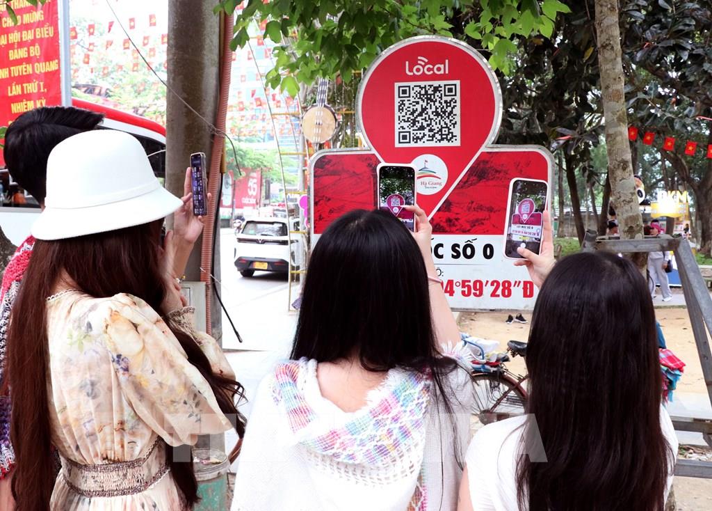 Du khách quét QR tại Km0 Hà Giang tim hiểu thông tin du lịch. Ảnh: Đức Thọ - TTXVN