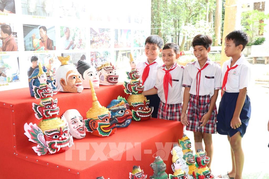Các học sinh tham quan, tìm hiểu mão, mặt nạ của đồng bào Khmer. Ảnh: Thanh Hòa- TTXVN