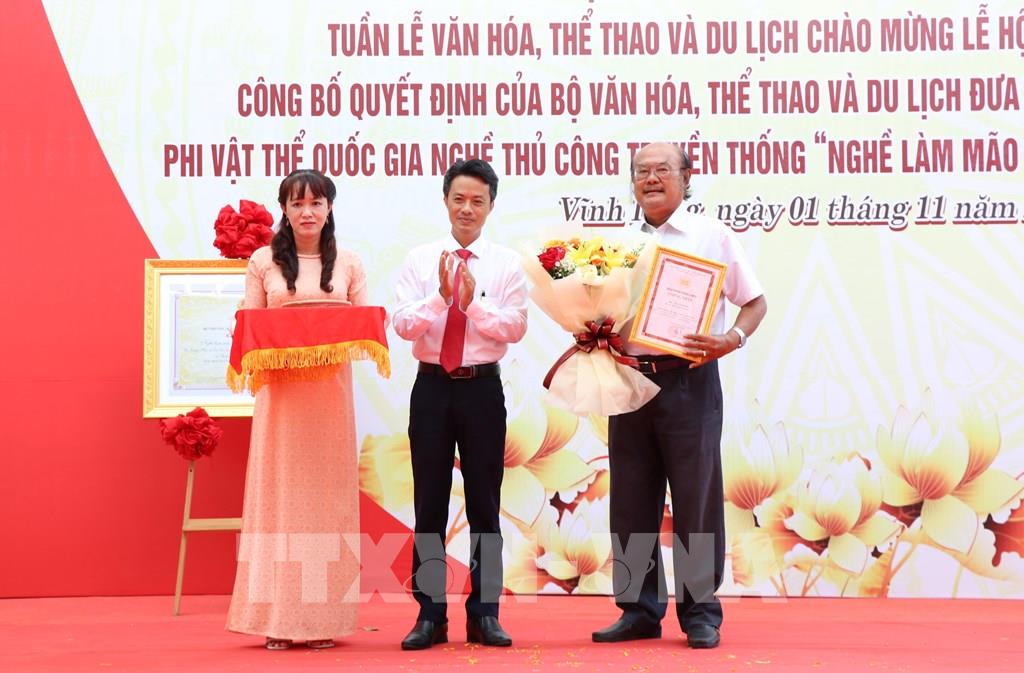 Lãnh đạo Sở Văn hóa, Thể thao và Du lịch tỉnh đón nhận Bằng chứng nhận di sản văn hóa phi vật thể quốc gia. Ảnh: Thanh Hòa- TTXVN
