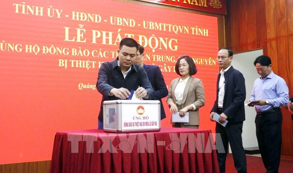 Cán bộ các địa phương tỉnh Quảng Trị ủng hộ đồng bào bị thiệt hại do lũ lụt. Ảnh: TTXVN phát