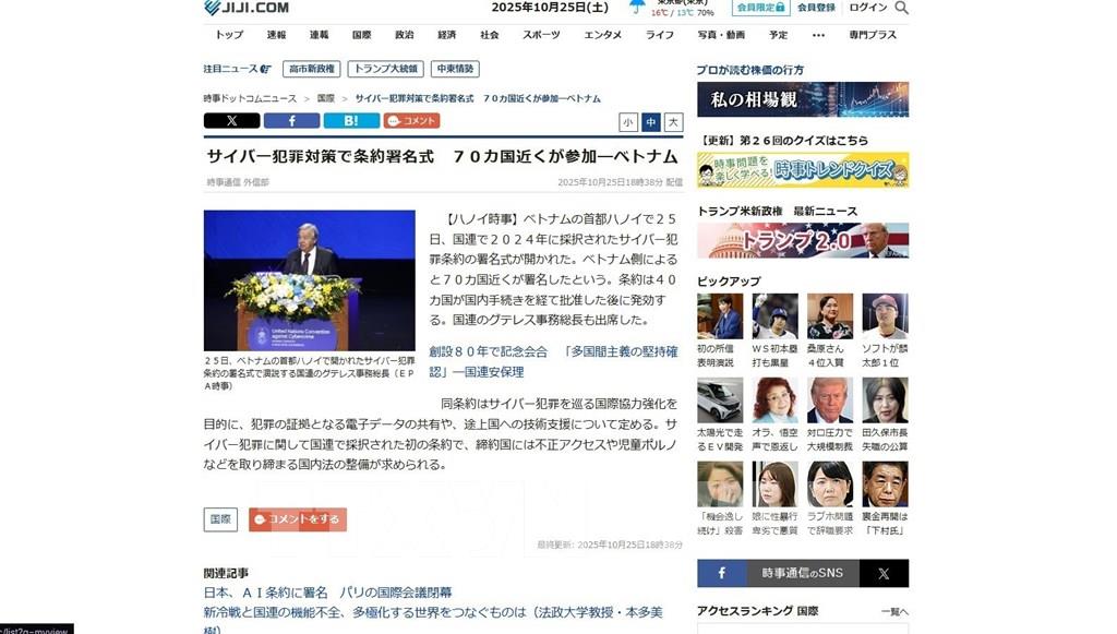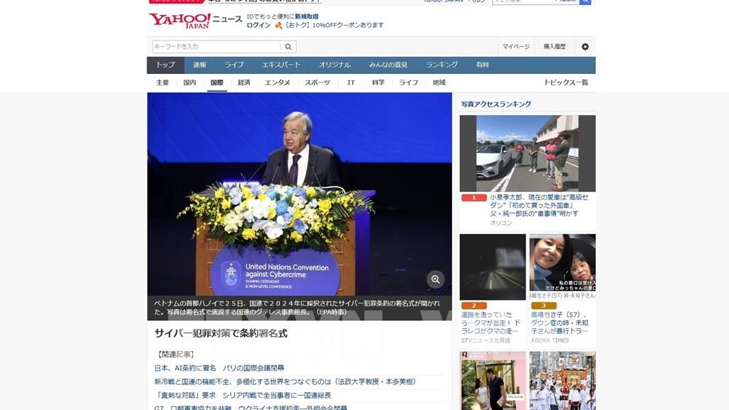 Theo phóng viên TTXVN tại Nhật Bản, hãng thông tấn Jiji đưa tin “Lễ mở ký Công ước về chống tội phạm mạng, được LHQ thông qua năm 2024, đã được tổ chức tại Hà Nội, Việt Nam, vào ngày 25/10”. Hãng Jiji dẫn nguồn truyền thông Việt Nam cho biết gần 70 quốc gia đã ký kết Công ước và văn bản này sẽ có hiệu lực sau khi 40 quốc gia hoàn tất thủ tục phê chuẩn trong nước.