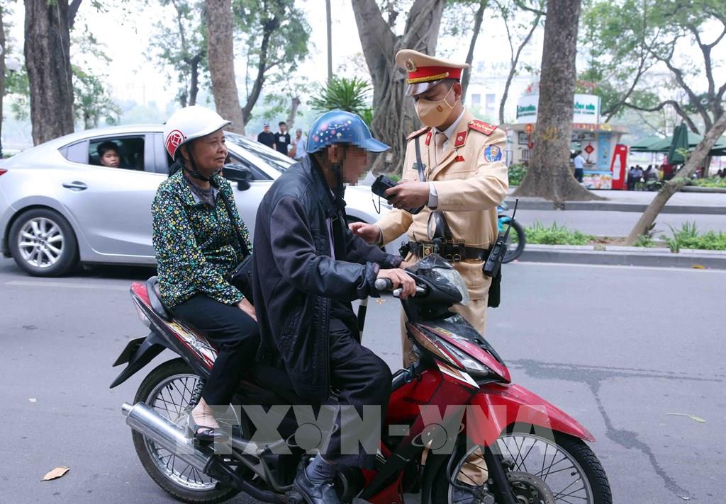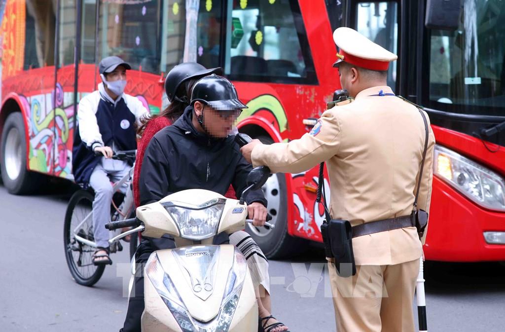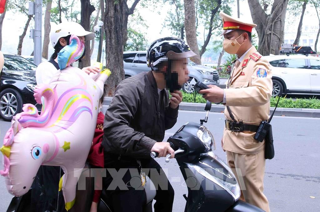 Trong sáng mùng 1 Tết, Đội Cảnh sát giao thông số 1, Công an Hà Nội đã bố trí nhiều tổ công tác trên các tuyến phụ trách, tập trung xử lý vi phạm nồng độ cồn với người điều khiển ô tô, xe máy và xe đạp. Ảnh: Phạm Kiên - TTXVN