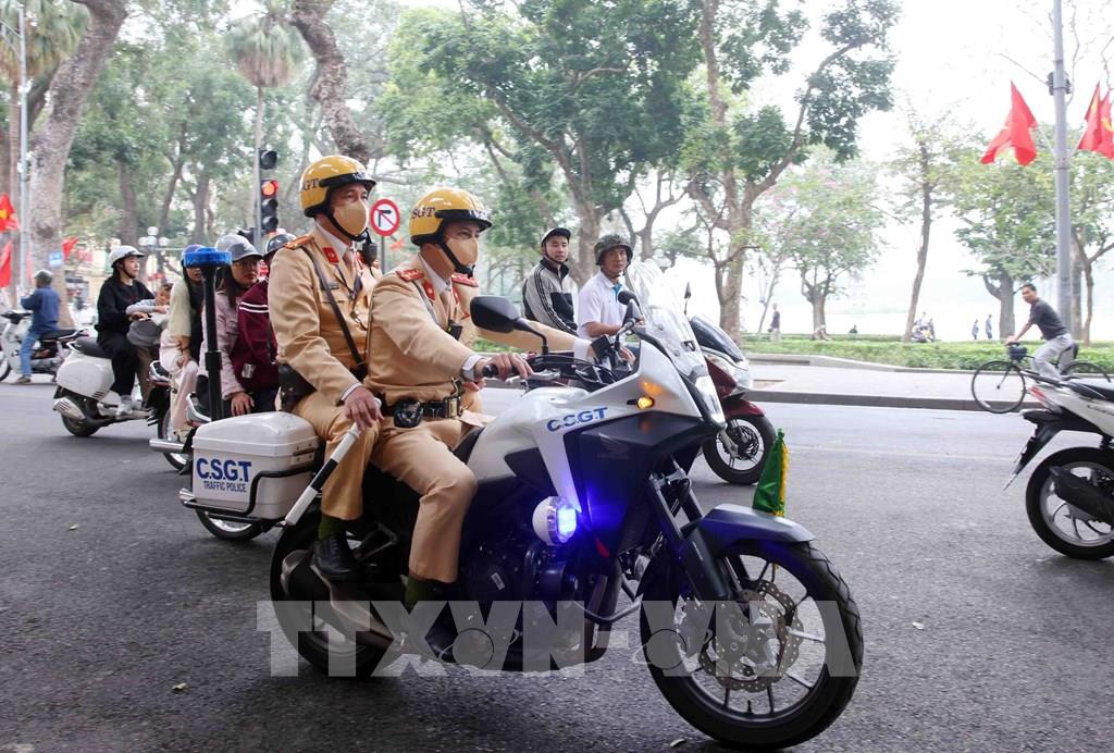 Lực lượng Cảnh sát giao thông điều tiết, phân luồng giao thông tại nút giao phố Tràng Tiền - Đinh Tiên Hoàng, Hà Nội trong sáng mùng 1 Tết. Ảnh: Phạm Kiên - TTXVN