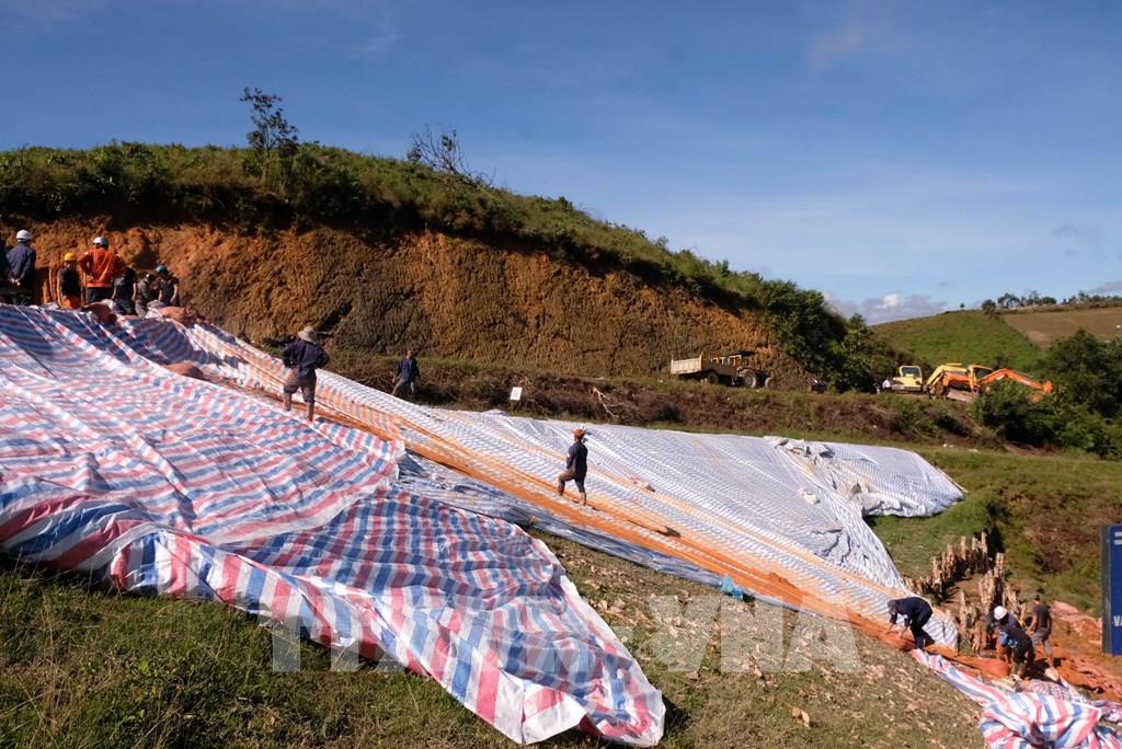 Hàng chục người và phương tiện vẫn tiếp tục triển khai các biện pháp gia cố phần thân đập của hồ thủy lợi Cay An (xã Tà Năng, Lâm Đồng) trong sáng 8/11. Ảnh: Nguyễn Dũng – TTXVN