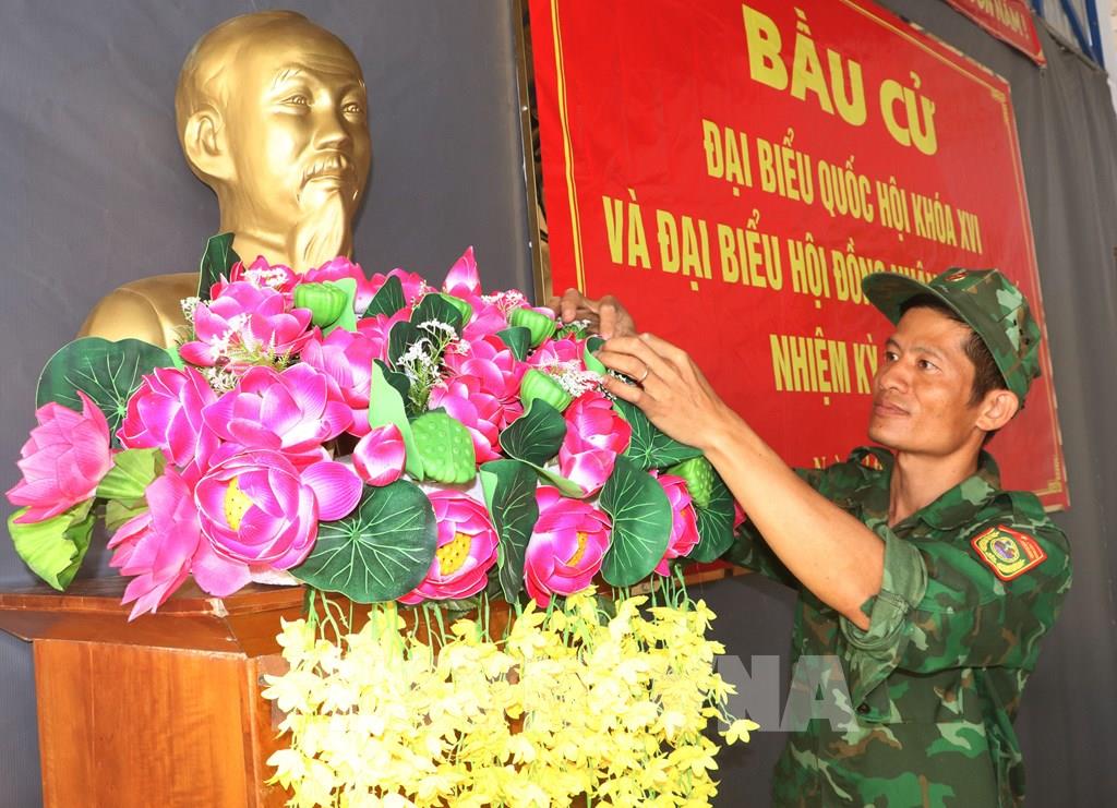Chiến sĩ Đồn Biên phòng Hòn Khoai trang trí tượng Chủ tịch Hồ Chí Minh cho khai mạc ngày bầu cử sớm 13/3. Ảnh: Tuấn Phi - TTXVN