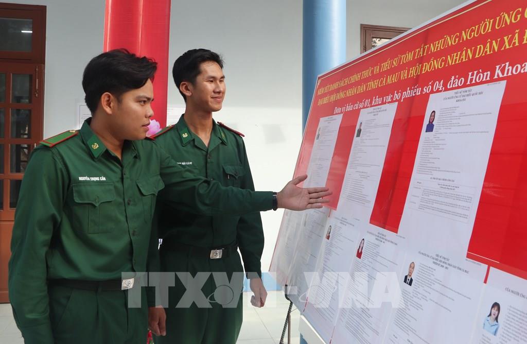 Các chiến sĩ xem danh sách ứng cử viên trước ngày bầu cử. Ảnh: Tuấn Phi - TTXVN
