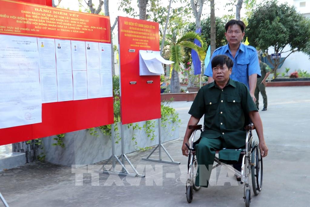 Nhân viên Trung tâm hỗ trợ cử tri Nguyễn Văn Thắng, thương binh hạng 1/4 tại tham gia bầu cử. Ảnh: Đoàn Mạnh Dương-TTXVN