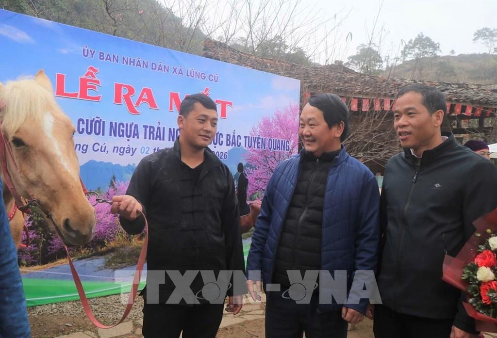 Du khách trải nghiệm cưỡi ngựa tham quan Lũng Cú (Tuyên Quang). Ảnh: TTXVN phát ; [02/01/2026 13:43:26] Sáng 2/1/2026, tại làng Thèn Pả, UBND xã Lũng Cú (Tuyên Quang) tổ chức ra mắt sản phẩm du lịch “Cưỡi ngựa trải nghiệm Cực Bắc – Tuyên Quang”, thu hút sự quan tâm của đông đảo đại biểu, người dân và du khách. Ảnh: TTXVN phát