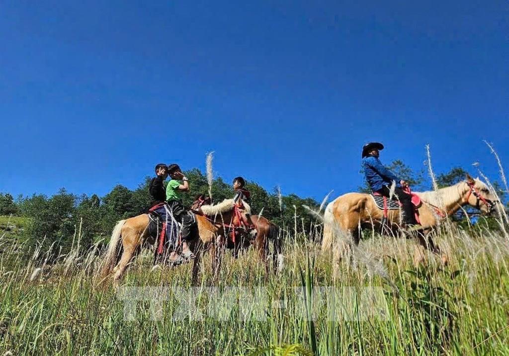 Du khách trải nghiệm cưỡi ngựa tham quan Lũng Cú (Tuyên Quang). Ảnh: TTXVN phát