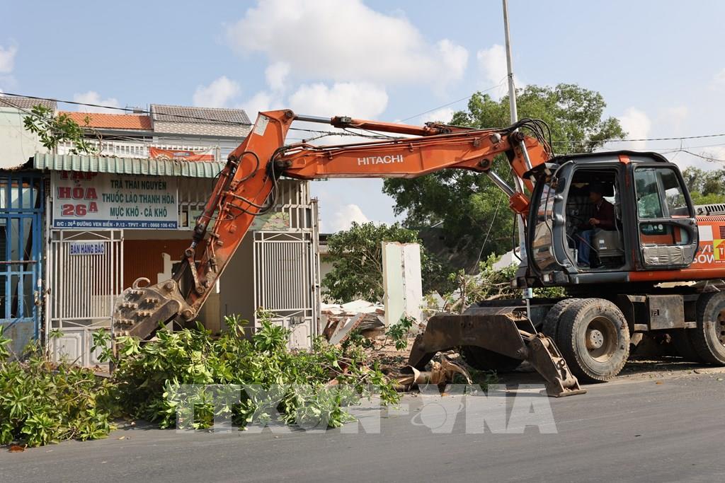 Máy xúc tiến hành tháo dỡ một căn nhà nằm trong dự án đường trục chính Vũng Tàu do chưa bàn giao mặt bằng. Ảnh: Hoàng Nhị - TTXVN