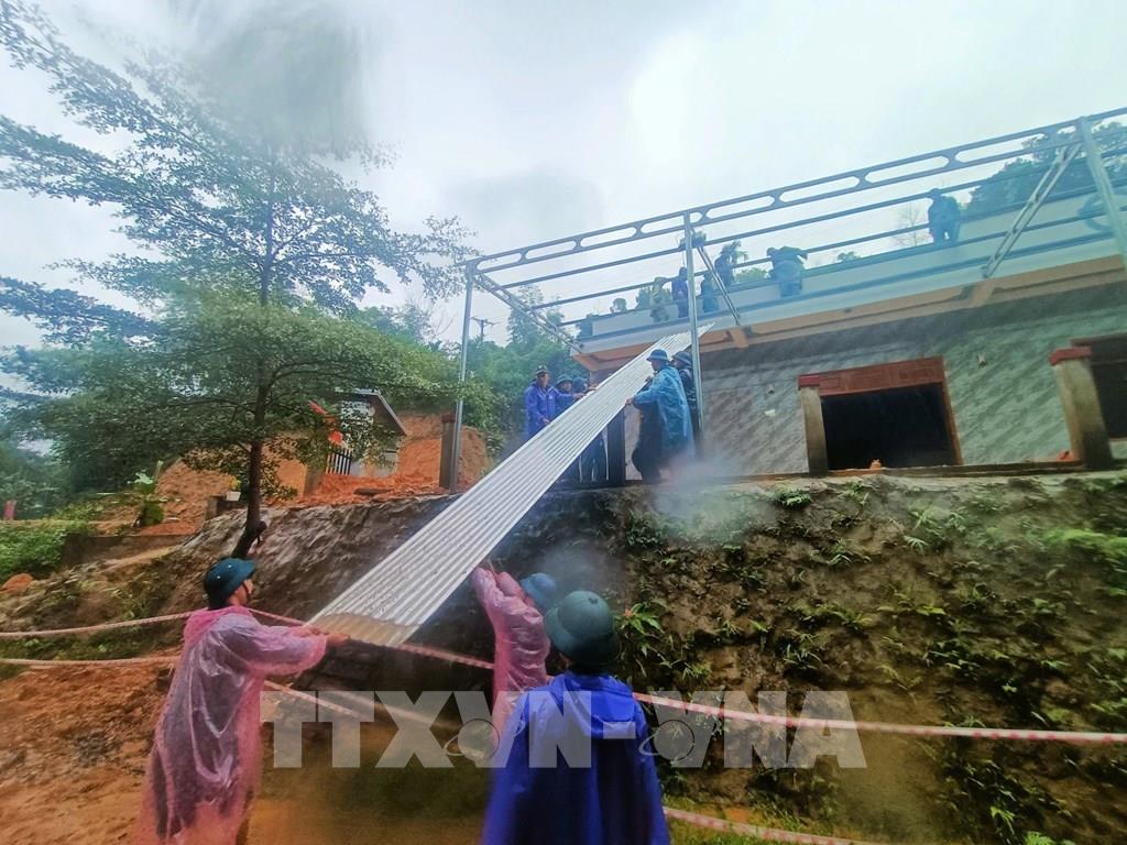 Một trong những ngôi nhà bị hư hại hoàn toàn ở xã Trà Leng đang được xây dựng mới. Ảnh: Đoàn Hữu Trung- TTXVN