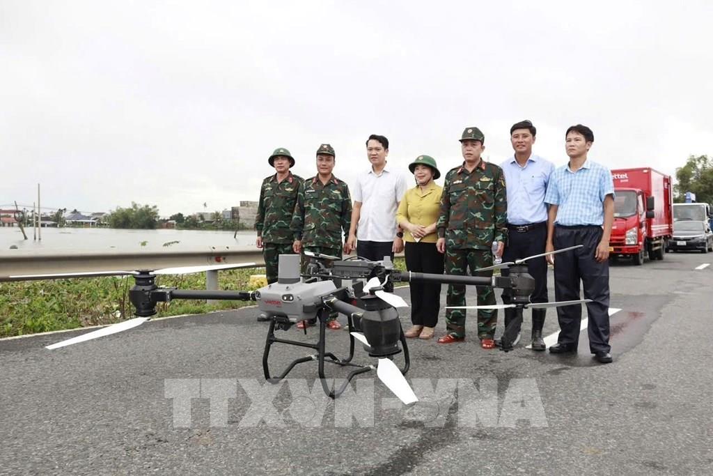 Bộ Chỉ huy Quân sự thành phố Đà Nẵng tiếp cận vùng ngập để cứu trợ cho bệnh nhân tại Bệnh viện Đa khoa Duy Xuyên. Ảnh: Khoa Chương - TTXVN Bộ Chỉ huy Quân sự thành phố Đà Nẵng sử dụng thiết bị bay Drone chuyên dụng vận chuyển hàng hóa, thuốc men và nhu yếu phẩm đến người dân vùng ngập sâu. Ảnh: Khoa Chương - TTXVN