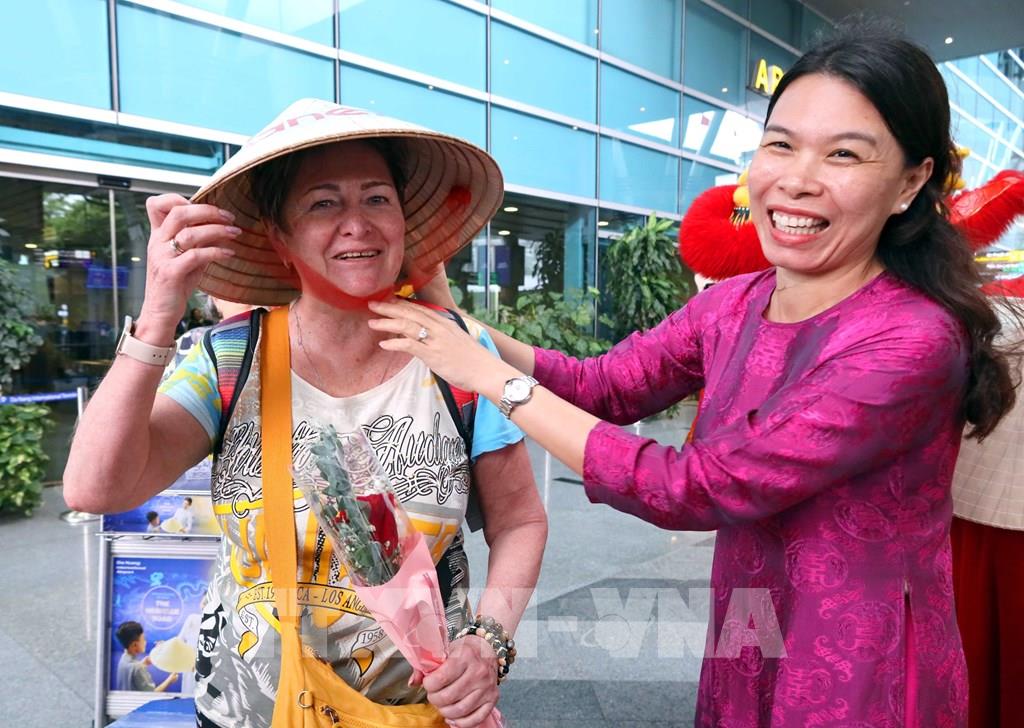 Đại diện Anex Tour Vietnam tặng nón lá cho những hành khách đầu tiên đến Đà Nẵng từ Vladivostok. Ảnh: Trần Lê Lâm - TTXVN