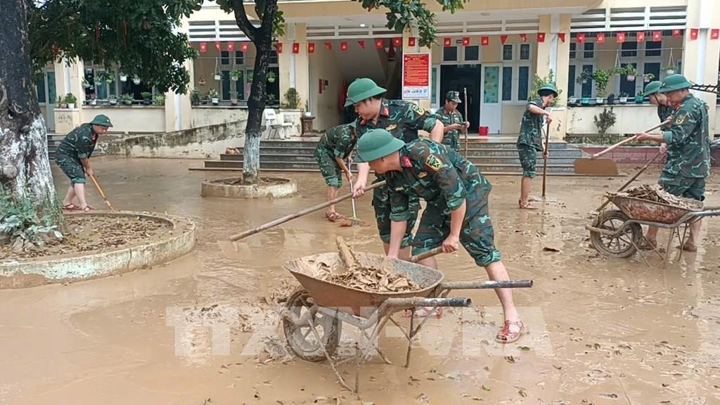 Công tác dọn dẹp bùn đất sau lũ tại Đà Nẵng đang được các chiến sỹ Quân khu 5 khẩn trương triển khai. Ảnh: Khoa Chương - TTXVN