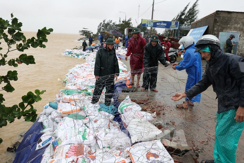 Cách khu vực bờ kè An Lương khoảng 1 km là nơi người dân tập trung xúc cát, cho vào bao để vận chuyển đi gia cố bờ kè. Tại đây có hàng trăm người dân, già trẻ, gái trai đang khẩn trương phối hợp với lực lượng quân đội để xúc cát. Chỉ với xẻng, bao tải và sức người, một đồi cát cao cả chục mét đã được xúc đi quá nửa để mang đắp đê chắn sóng.