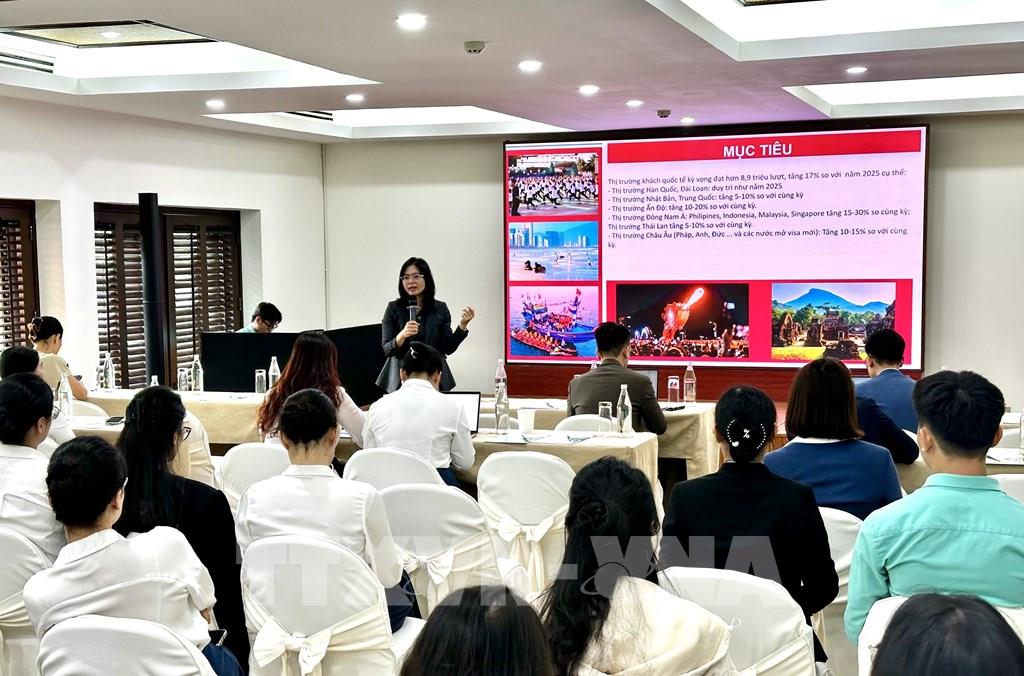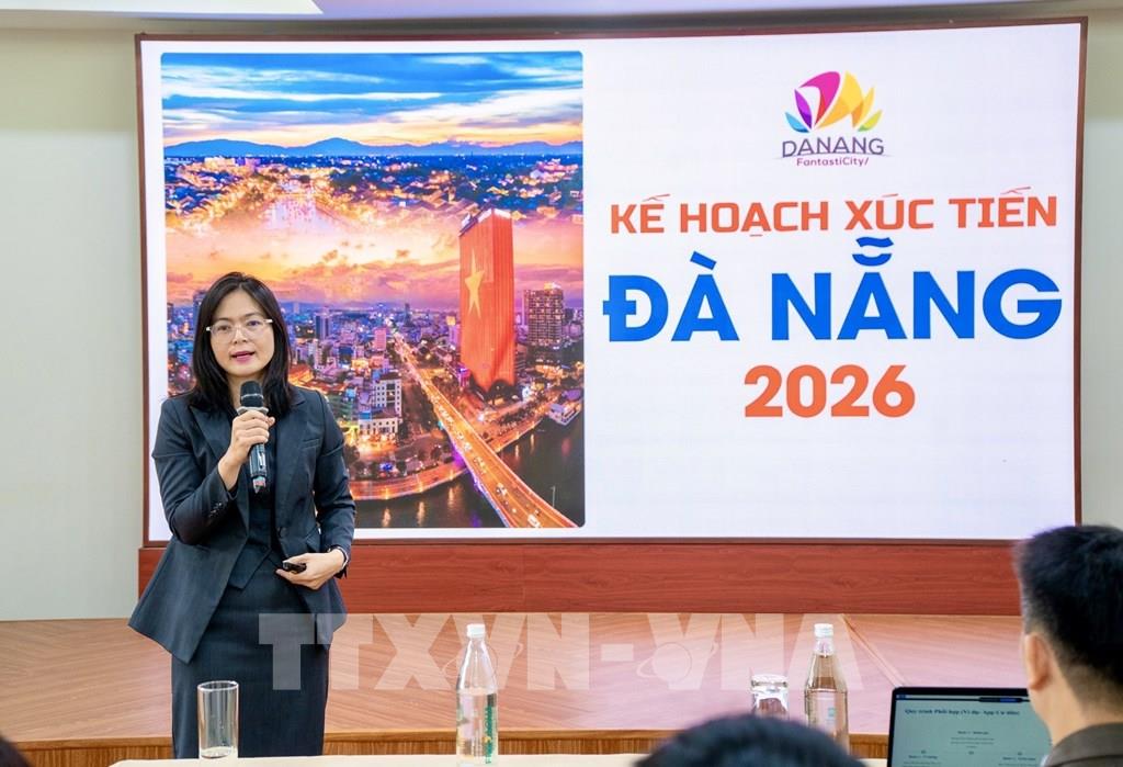Giám đốc Trung tâm Xúc tiến Du lịch thành phố Đà Nẵng Nguyễn Thị Hồng Thắm chia sẻ tại Hội thảo về các kế hoạch đường bay và chương trình xúc tiến du lịch thành phố năm 2026. Ảnh: Trần Lê Lâm - TTXVN