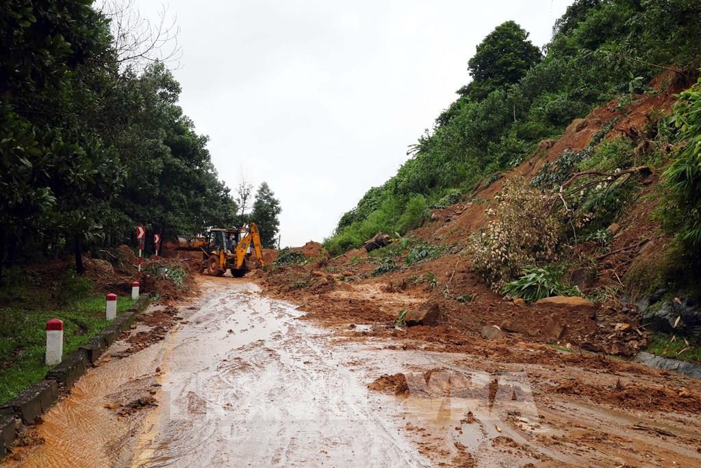Lực lượng chức năng đang huy động phương tiện máy móc để khắc phục những điểm sạt lở nghiêm trọng trên tuyến đường Hồ Chí Minh qua xã Khâm Đức, thành phố Đà Nẵng. Ảnh: Đỗ Trưởng – TTXVN