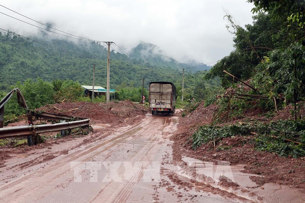 Điểm sạt lở trên tuyến đường Hồ Chí Minh qua xã Bến Giằng (Đà Nẵng) đã được khắc phục tạm, thông tuyến một làn đường. Ảnh: Đỗ Trưởng – TTXVN