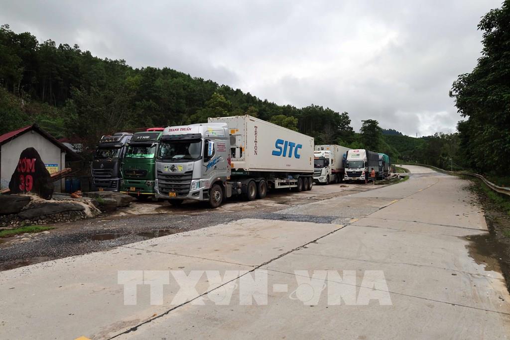 Nhiều xe tải đi trên tuyến đường Hồ Chí Minh đang tiếp tục phải nằm ven đường tại xã Khâm Đức chờ đợi đường nhanh được thông tuyến trở lại. Ảnh: Đỗ Trưởng – TTXVN