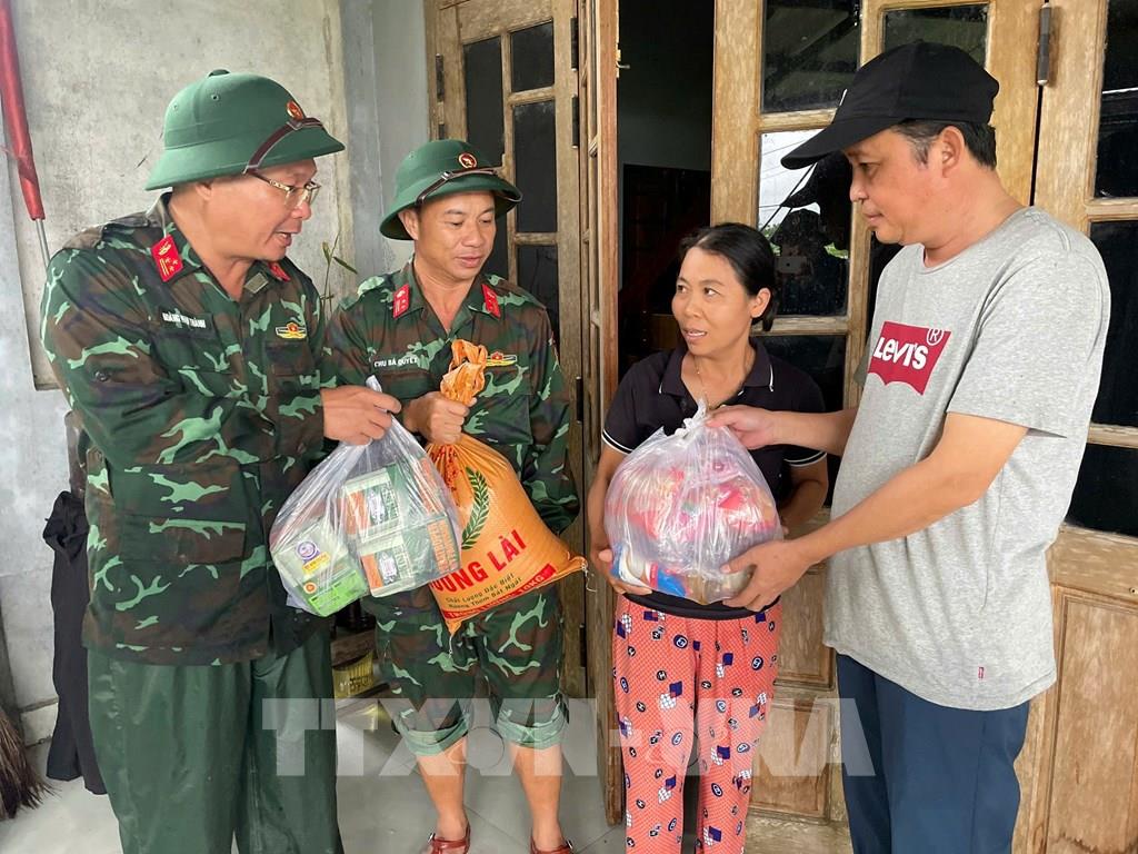 Lãnh đạo Lữ đoàn 574 (Bộ Tư lệnh Quân khu 5) trao quà hỗ trợ cho người dân vùng lũ ở xã Quế Phước (Đà Nẵng). Ảnh: TTXVN phát