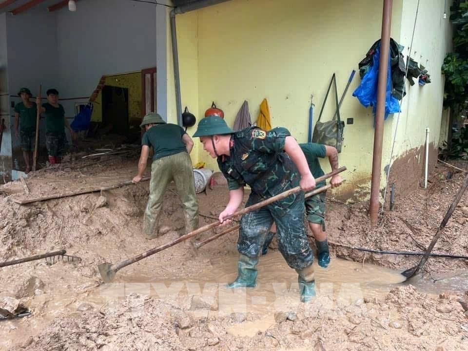 Cán bộ, chiến sĩ Lữ đoàn 574 (Bộ Tư lệnh Quân khu 5) hỗ trợ người dân xã Quế Phước (Đà Nẵng) khắc phục hậu quả của mưa lũ. Ảnh: TTXVN phát