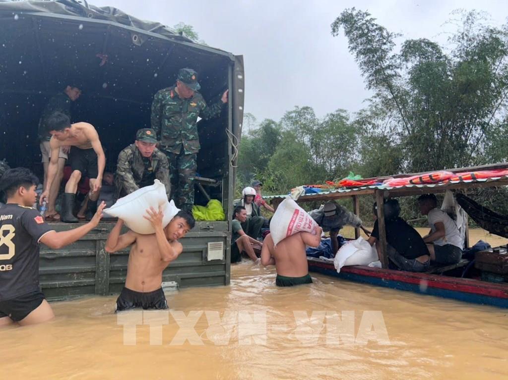 Cán bộ, chiến sĩ Lữ đoàn 574 (Bộ Tư lệnh Quân khu 5) hỗ trợ vận chuyển nhiều tấn hàng thiết yếu tại xã Quế Phước (Đà Nẵng) để cấp phát kịp thời đến từng hộ dân khắc phục hậu quả của mưa lũ. Ảnh: TTXVN phát