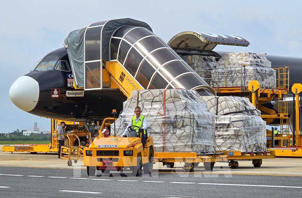Hàng hóa viện trợ được đưa xuống máy bay. Ảnh: TTXVN phát