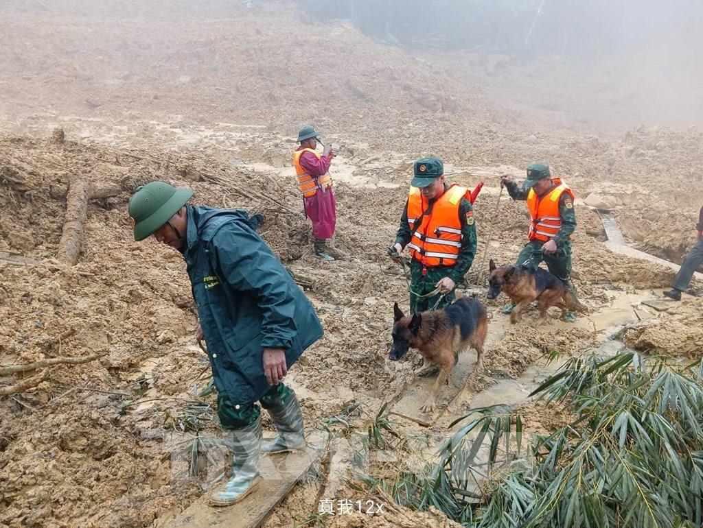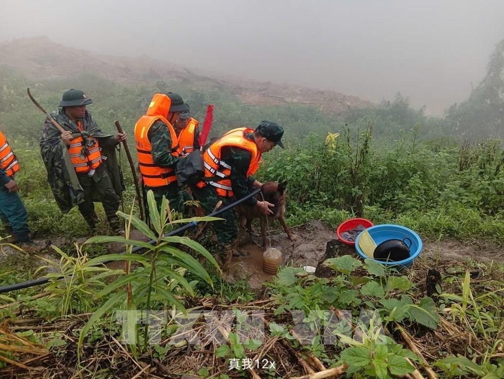 Triển khai lực lượng tìm kiếm nạn nhân mất tích trong vụ sạt lở ở xã biên giới Hùng Sơn với sự hỗ trợ của chó nghiệp vụ. Ảnh: Bộ Tư lệnh Quân khu 5/TTXVN phát