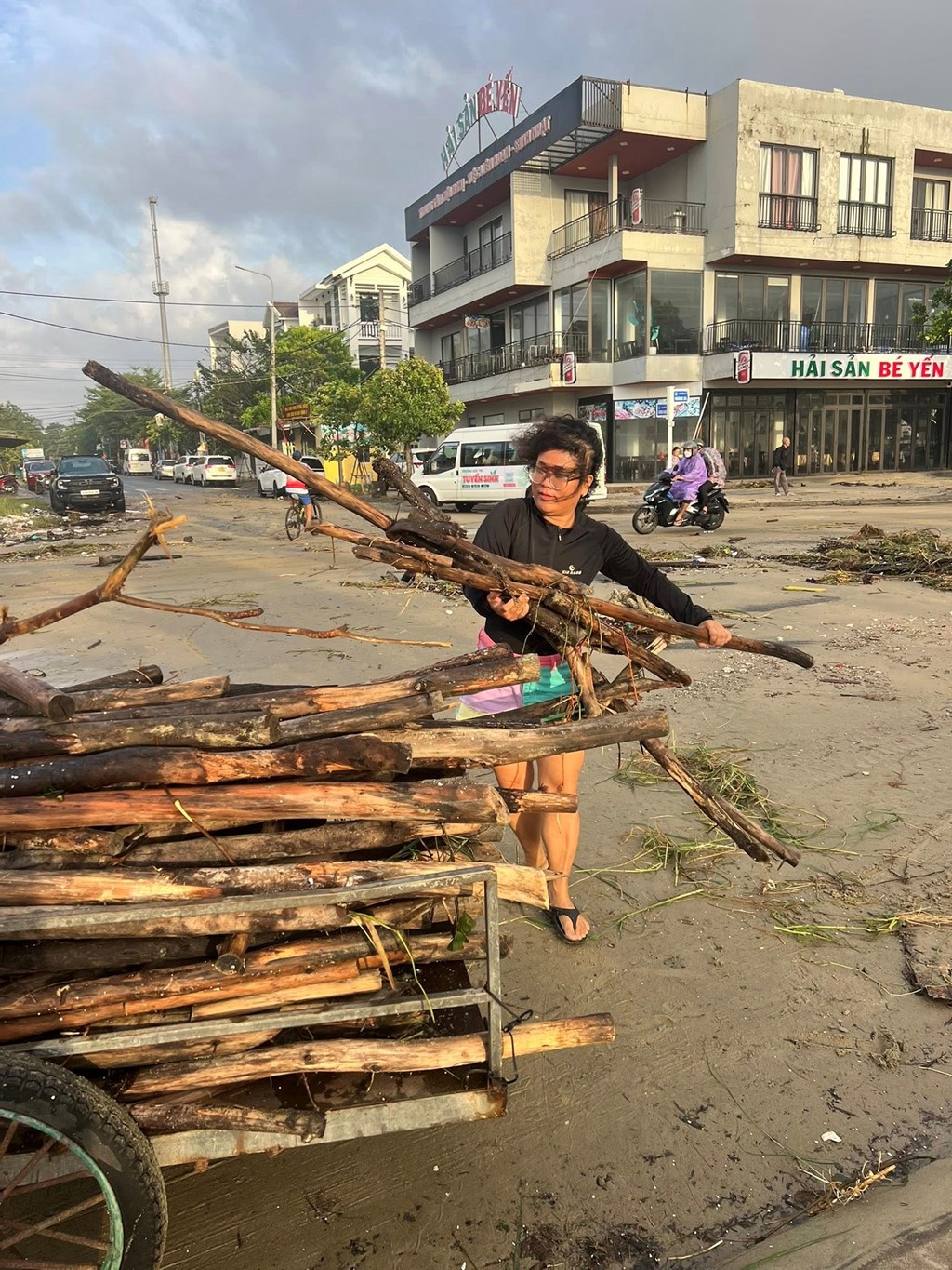 Người dân sống gần biển Mân Thái, Đà Nẵng dọn dẹp cây gỗ, củi rác sau bão số 13. Ảnh: Hương Bùi/Bnews