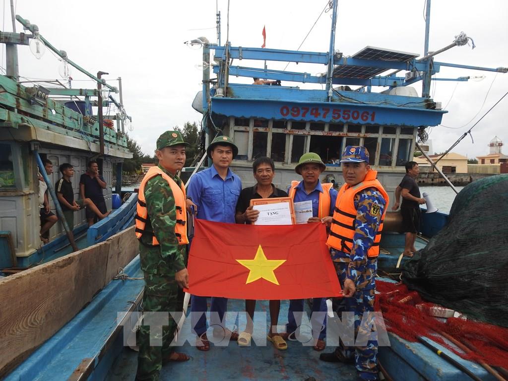 Cán bộ, chiến sĩ hải quân tặng cờ Tổ quốc cho các tàu thuyền vào tránh trú bão số 15. Ảnh: TTXVN phát