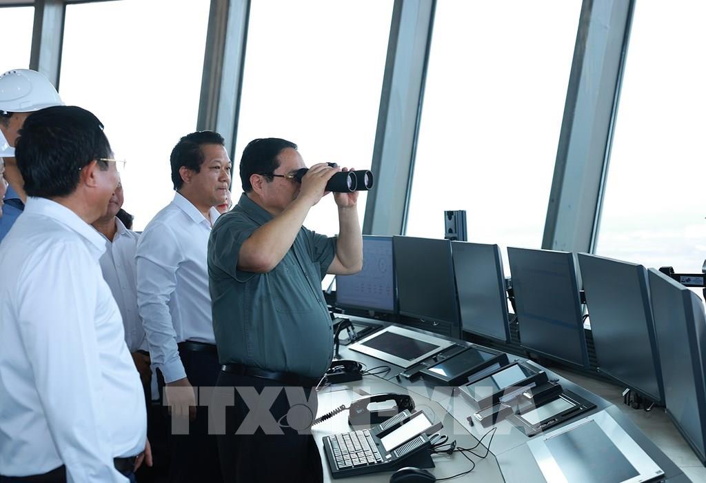 Thủ tướng Phạm Minh Chính quan sát tổng quan Dự án cảng hành không quốc tế Long Thành từ Đài kiểm soát không lưu. Ảnh: Dương Giang-TTXVN