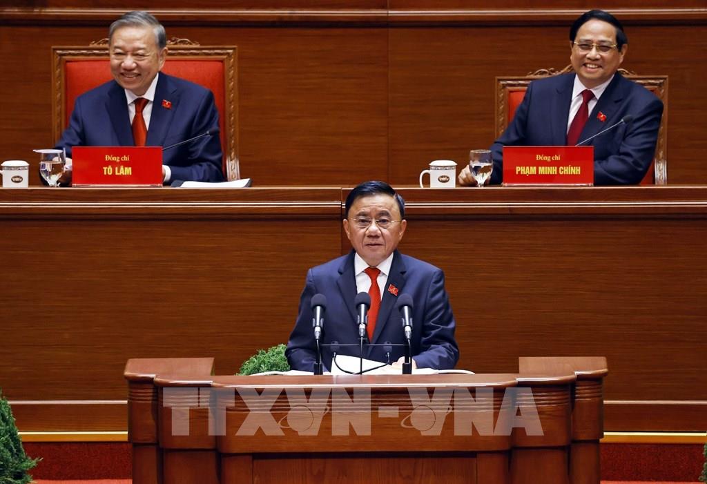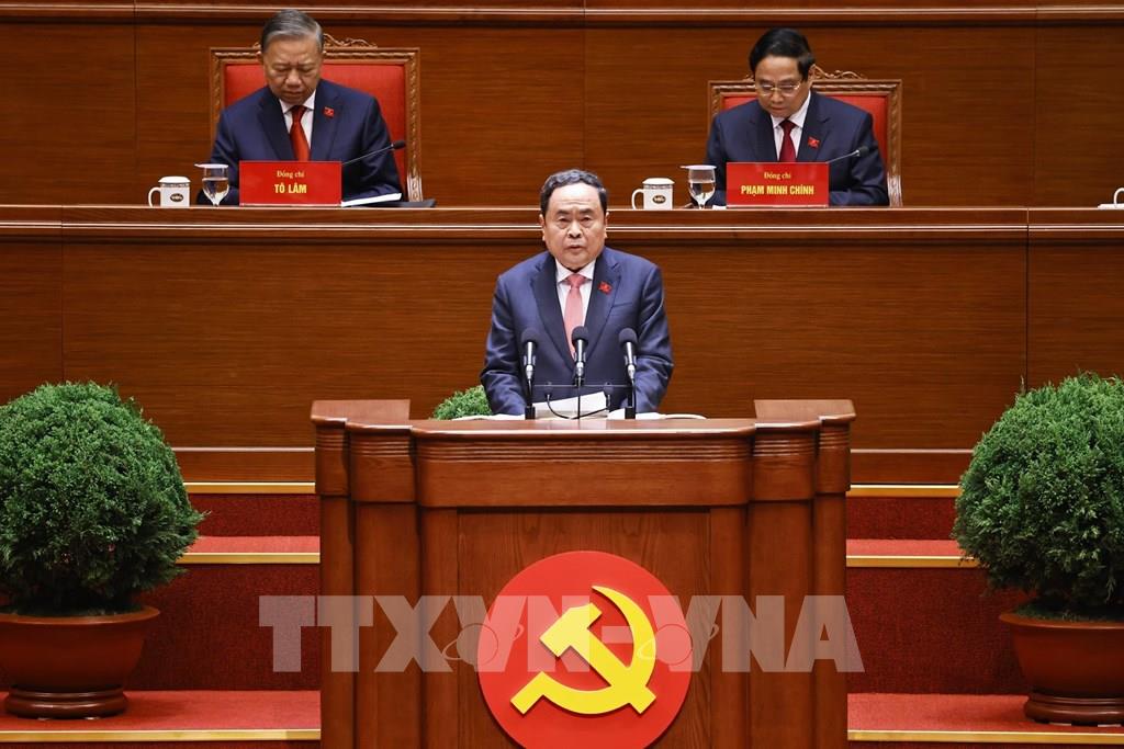 Đồng chí Trần Thanh Mẫn thay mặt Đoàn Chủ tịch báo cáo kết quả bầu Bộ Chính trị, Tổng Bí thư, Ban Bí thư, Ủy ban Kiểm tra Trung ương, Chủ nhiệm Ủy ban Kiểm tra Trung ương khóa XIV. Ảnh: TTXVN