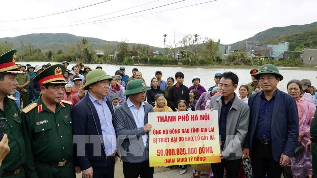 Đại diện lãnh đạo thành phố Hà Nội tặng tiền ủng hộ nhân dân Gia Lai. Ảnh: Sỹ Thắng/TTXVN