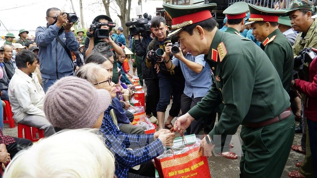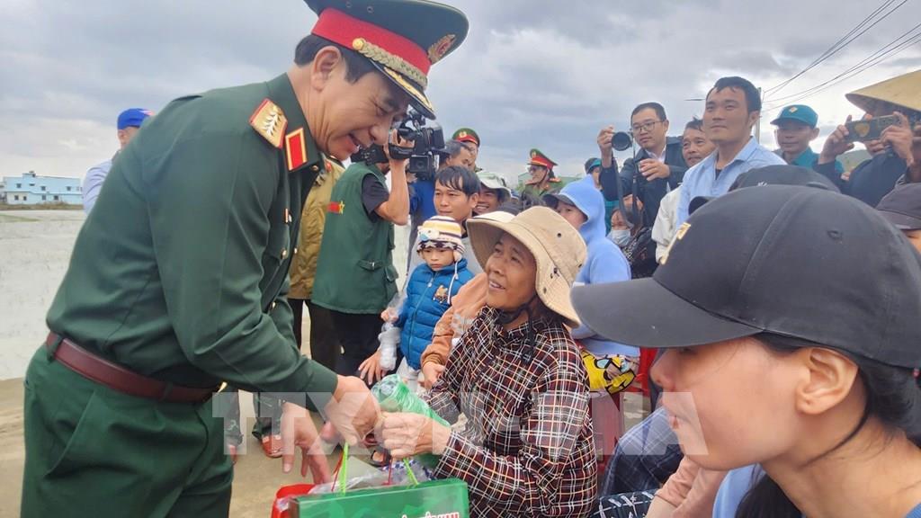 Bộ trưởng Bộ Quốc phòng Đại tướng Phan Văn Giang thăm tặng quà người dân vùng lũ ở xã Tuy Phước. Ảnh: Sỹ Thắng/TTXVN