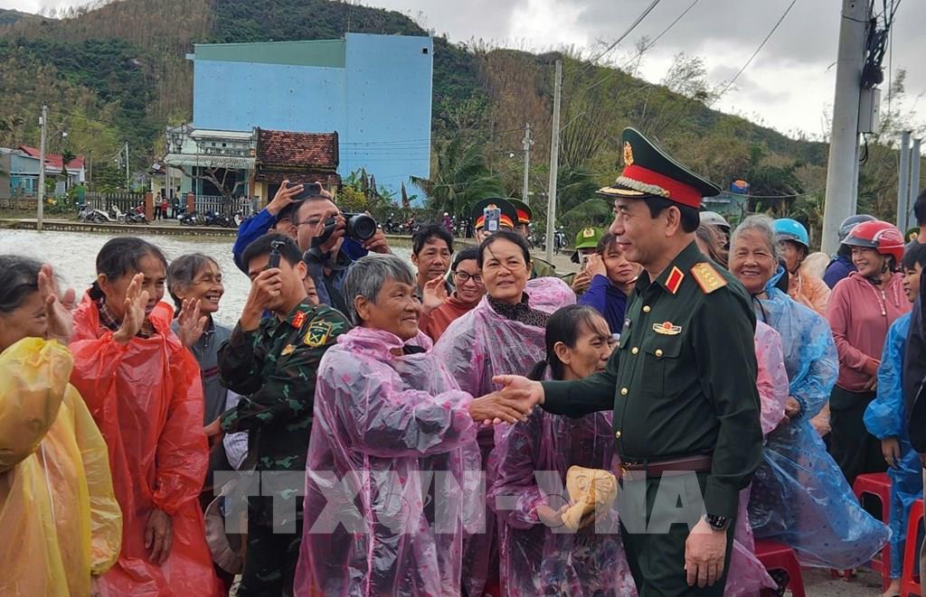 Bộ trưởng Bộ Quốc phòng Đại tướng Phan Văn Giang thăm hỏi người dân vùng lũ ở xã Tuy Phước. Ảnh: Sỹ Thắng/TTXVN