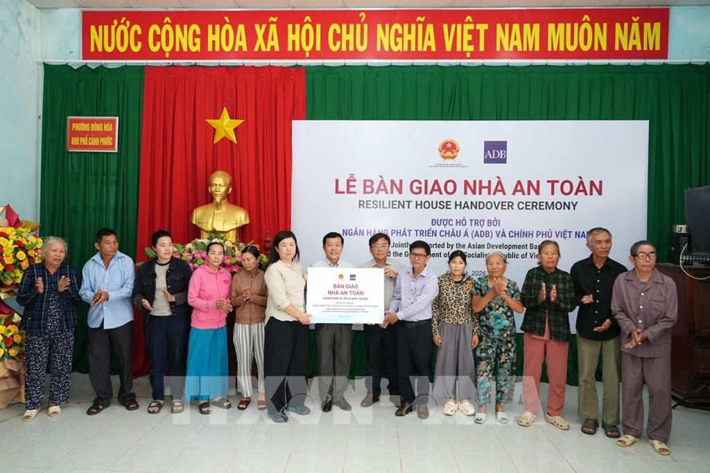Trao bảng tượng trưng bàn giao nhà an toàn cho người dân. Ảnh: TTXVN phát.
