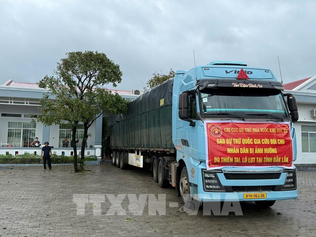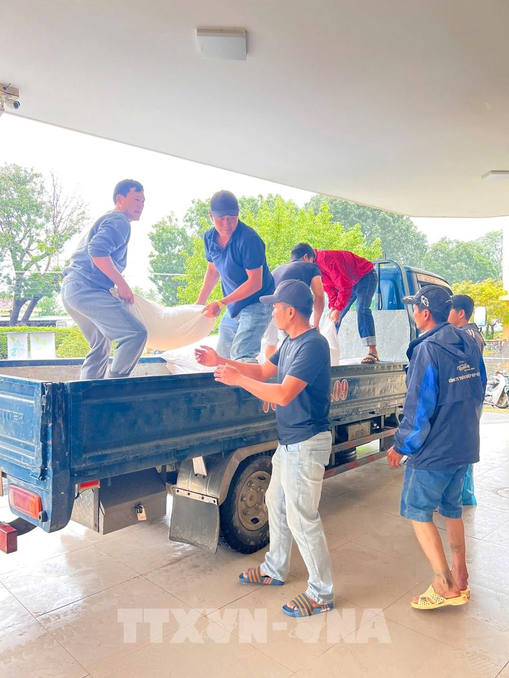 Gạo cứu trợ được vận chuyển đến các địa phương chịu thiệt hại nặng nề do lũ lụt tại Đắk Lắk. Ảnh: TTXVN phát