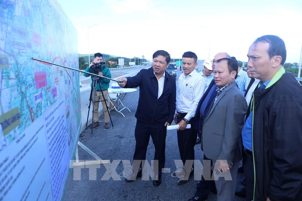 Bí thư Tỉnh ủy Đắk Lắk Lương Nguyễn Minh Triết (bên trái, ngoài cùng) chỉ đạo chủ đầu tư đẩy nhanh tiến độ thi công dự án. Ảnh: Tuấn Anh - TTXVN