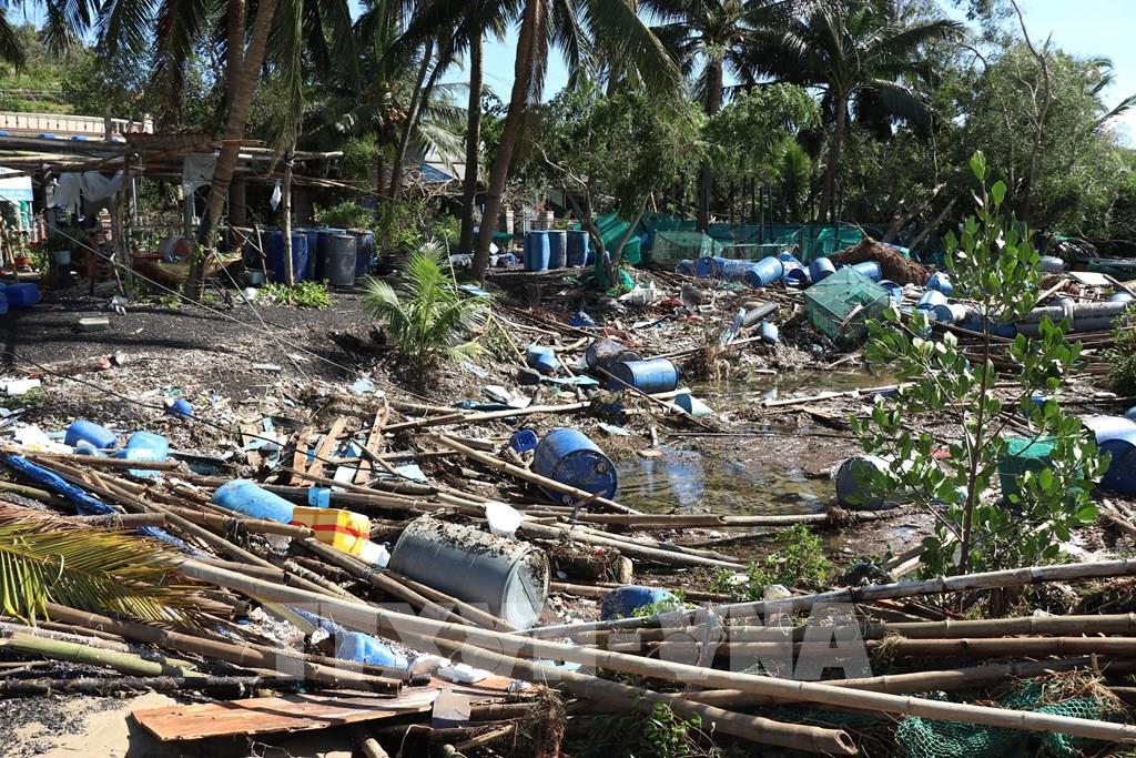 Lồng, bè của người dân phường Sông Cầu tan hoang sau bão. Ảnh: Tuấn Anh – TTXVN